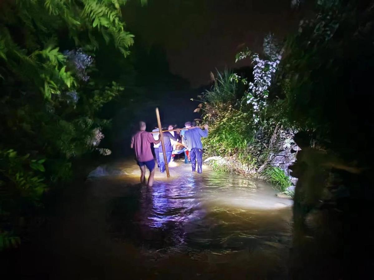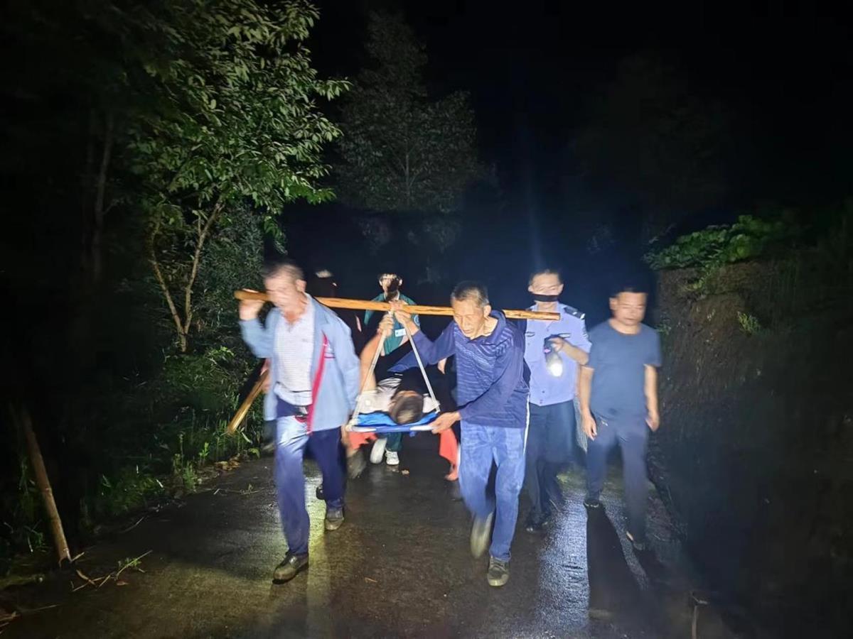 经医护人员初步检查,司机身上多处骨折,需尽快送医治疗。于是,民警与群众迅速找来担架、绳子和扁担,一起将受伤司机抬到担架上并牢牢固定。为了保持担架平稳,尽量减少剧烈运动对受伤司机造成二次伤害,众人只能沿着河道慢慢将受伤司机往山脚下的路边抬。一路上,大家淌过过膝的河水、借助手电的微光摸索着向岸边前进,在众人的齐心协力下,经过近半小时路程,受伤司机被安全转移到路边的救护车上并送往医院。