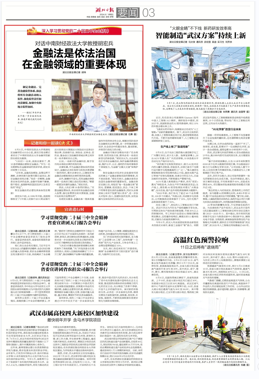 8月5日,中南财经政法大学南湖校区金融学院418办公室,湖北日报全媒记者采访了中南财经政法大学金融学院副院长胡宏兵教授。