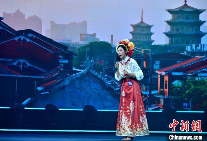 图为头戴泉州蟳埔“簪花围”的参赛选手在“我为文旅上大分”环节中展示福建文旅特色。 中新网记者 张斌 摄