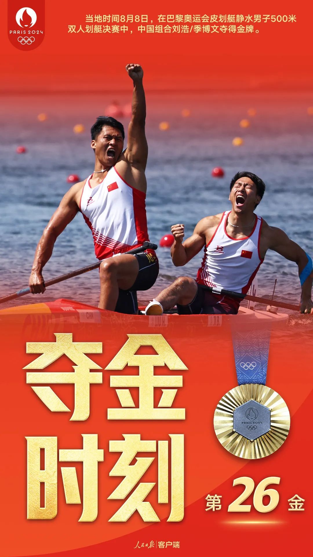 当地时间8月8日,中国组合刘浩/季博文夺得巴黎奥运会皮划艇静水男子500米双人划艇金牌。这是继2004年雅典奥运会和2008年北京奥运会后,中国队第三次获得该项目金牌。