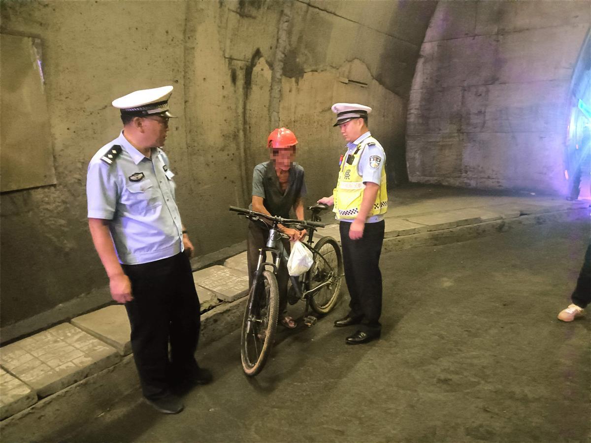 接警后,巡逻交警迅速驱车赶赴现场。发现一名男子正在隧道内右侧车道上骑行,身旁是一辆辆呼啸而过的车辆,稍有不慎极易发生交通事故,后果不堪设想。交警迅速将其拦停,将该男子和自行车带至就近的歇马收费站站外。