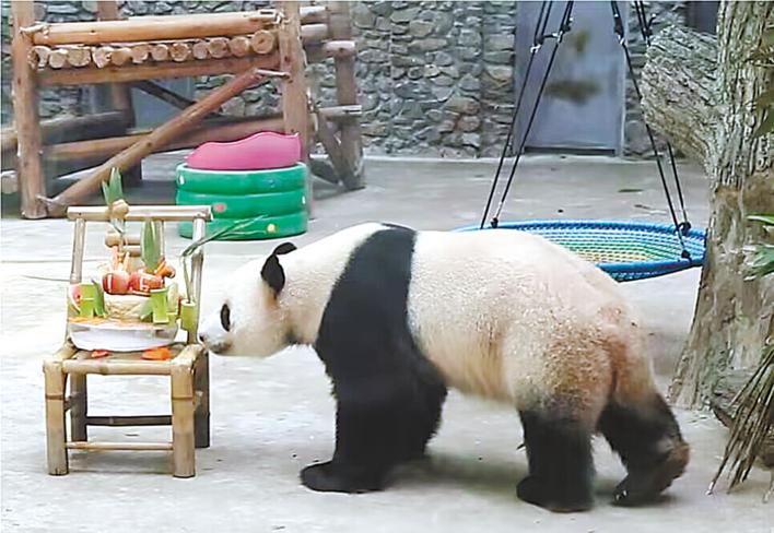 8月8日,大熊猫“奥运”喜庆16岁生日。 (视频截图)