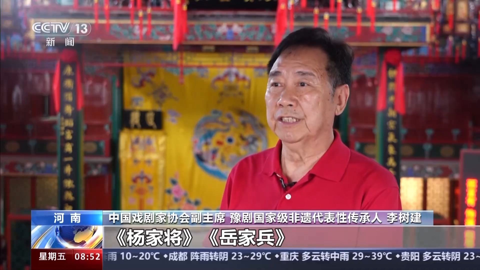 中国戏剧家协会副主席 豫剧国家级非遗代表性传承人 李树建:豫剧它演的是家国情怀,《杨家将》《岳家兵》《穆桂英》《花木兰》 ,它演的都是忠孝节义,我演出的剧目《程婴救孤》《清风亭》《苏武牧羊》《义薄云天》,另外我们演出的 《三哭殿》,它又是家国情怀,又是反映了老百姓中间的生活,所以豫剧能受到广大老百姓的欢迎。