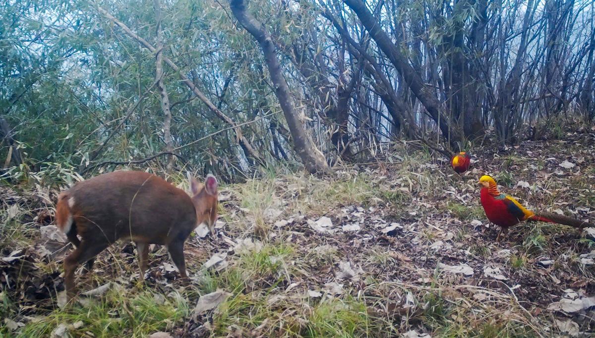 立秋前后,湖北堵河源国家级自然保护区(竹山县)白河管理站工作人员在整理红外相机资料影像时,惊喜地抓拍到一只黄麂与两只红腹锦鸡在林中“同框”的画面。