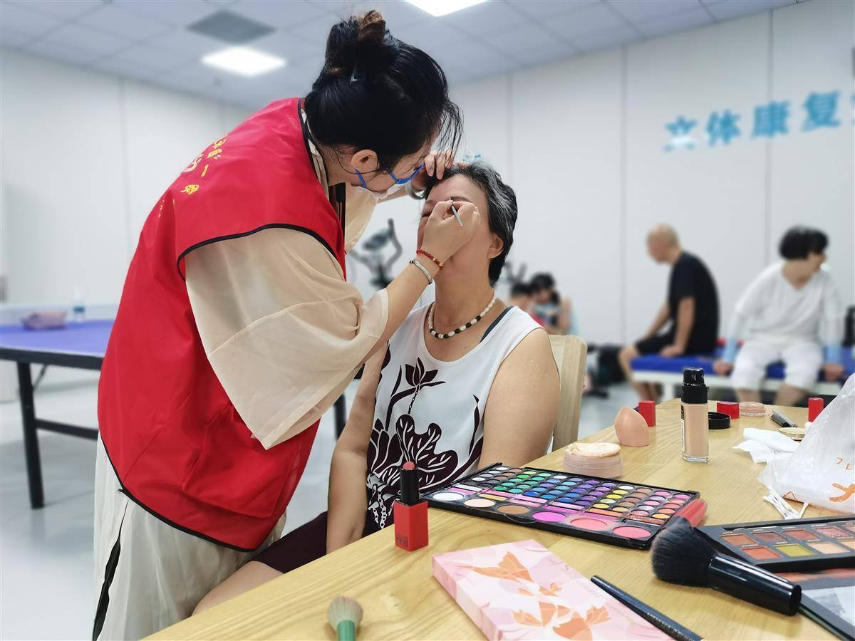 当天早晨,报名参加拍照的十对夫妻早早地来到社区事先准备好的临时化妆室,挑选婚纱、礼服,大家既期待又紧张,幸福之情溢于言表。化妆师挨个给“新娘子”梳妆打扮,描眉毛、擦粉、涂口红……在化妆师和造型师的精心装扮下,化了妆的阿姨们让大家惊艳,打扮好了的爷叔们,让人眼前一亮。