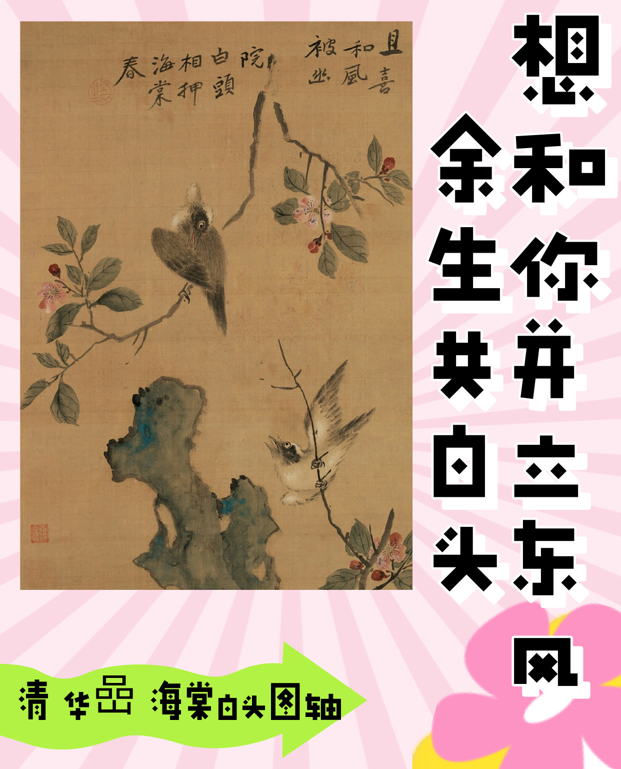 华喦为“扬州八怪”之一,擅画花鸟。图中所绘海棠花常在诗词中被比作佳丽,白头翁有“白头偕老”的寓意,石则寓意坚贞刚强、长长久久。此作为祝愿婚姻美满的典型作品。