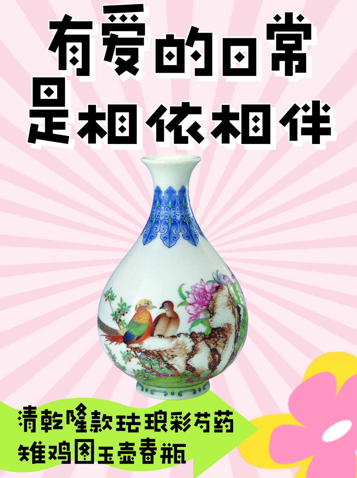 腹部珐琅彩绘两只雌雄雉鸡栖身于山石上,彼此相偎,作态亲昵,周围衬以芍药花及秋季花草。“芍药花”也叫将离草,是爱情花的一种。