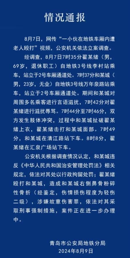 据“青岛地铁公安”微信公众号消息,8月9日,青岛市公安局地铁分局发布情况通报,8月7日,网传“一小伙在地铁车厢内遭老人殴打”视频,公安机关依法立案调查。经调查,23岁的男子和某城曾对69岁的男子翟某绪滋扰辱骂,随后双方发生肢体冲突。(据8月9日央视网报道)