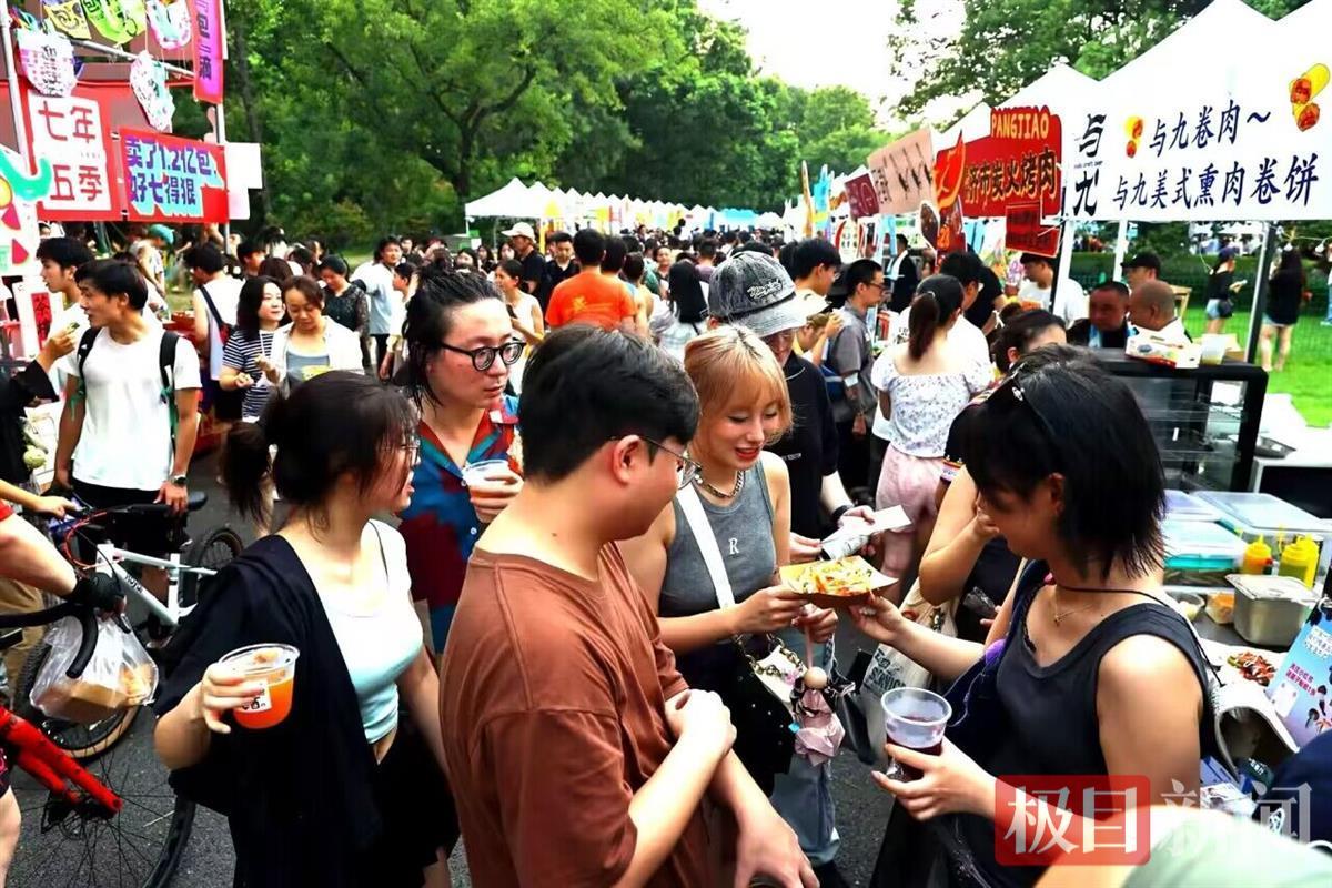 不敢入水的人,也能在这儿找到夏日的欢乐。湖畔边,市集一字排开,户外运动、文创礼品、特色美食、咖啡甜品摊位超90家,其中不乏许多武汉本土品牌。