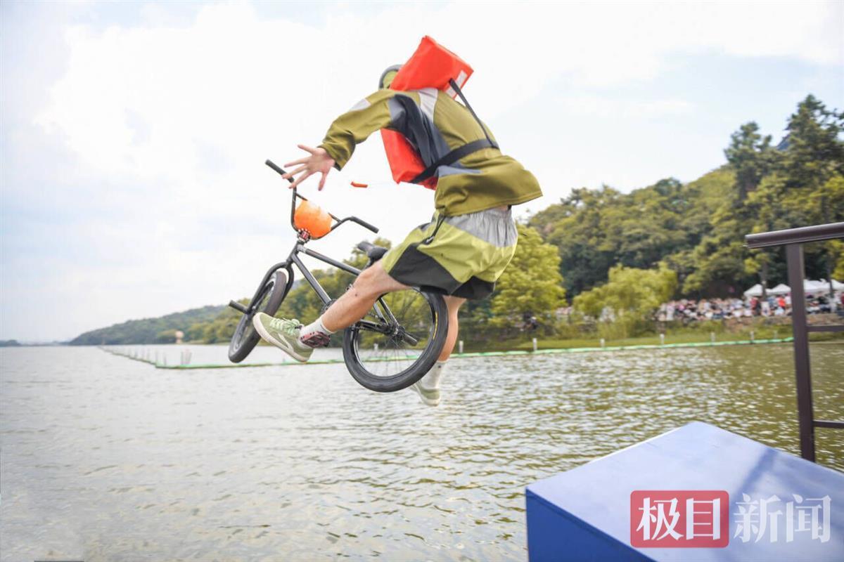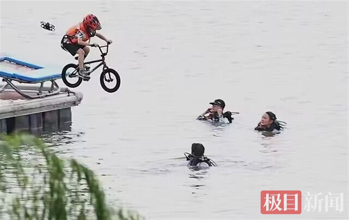 对于武汉人而言,没有“跳东湖”的夏天,是不完整的。当天下午,极目新闻记者在现场看到,参与人员或赤手空拳,潇洒一跃,或踩着滑板、骑着单车,挑战花式入水姿势。每次入水,都赢来岸上观众欢呼声一片,现场气氛热烈。