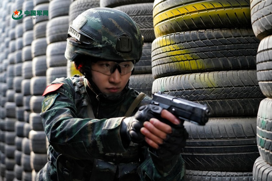 崔婕进行房间突入训练。
