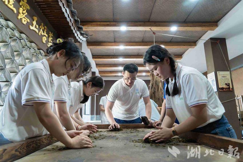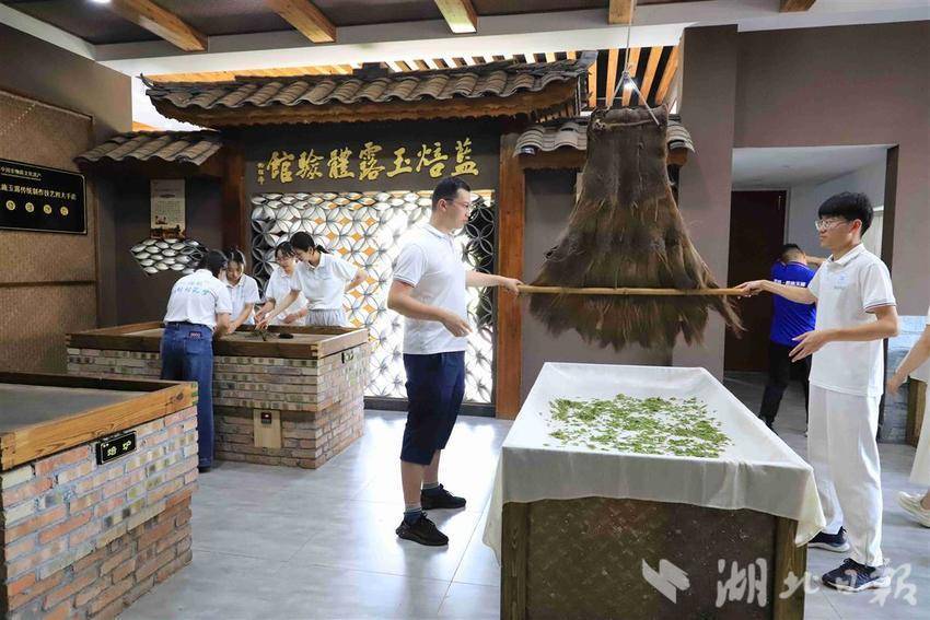 湖北日报讯(记者张歆、通讯员张蕾、李玲玲)鲜嫩茶叶采摘、鲜叶摊放、蒸汽杀青、搧干水汽、炒头毛火、揉捻、铲二毛火、整形上光、焙火提香、精心拣选……近日,在茶农和制茶师傅的悉心指导下,武汉轻工大学硒科学与工程现代产业学院“心心向农”社会实践团队队员们体验了恩施雨露制作全过程。