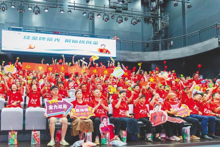 昌先圣(前排左三)观看女儿的比赛。 (湖北日报通讯员 郑恒 摄)