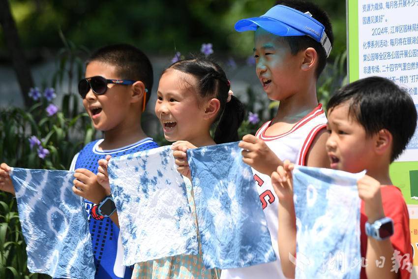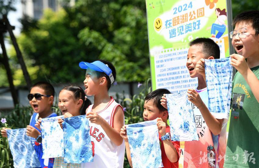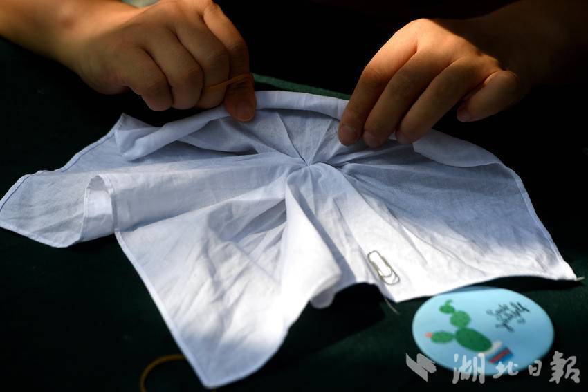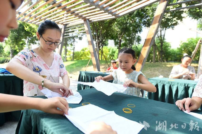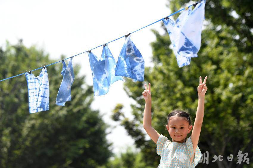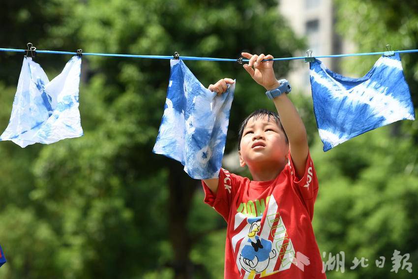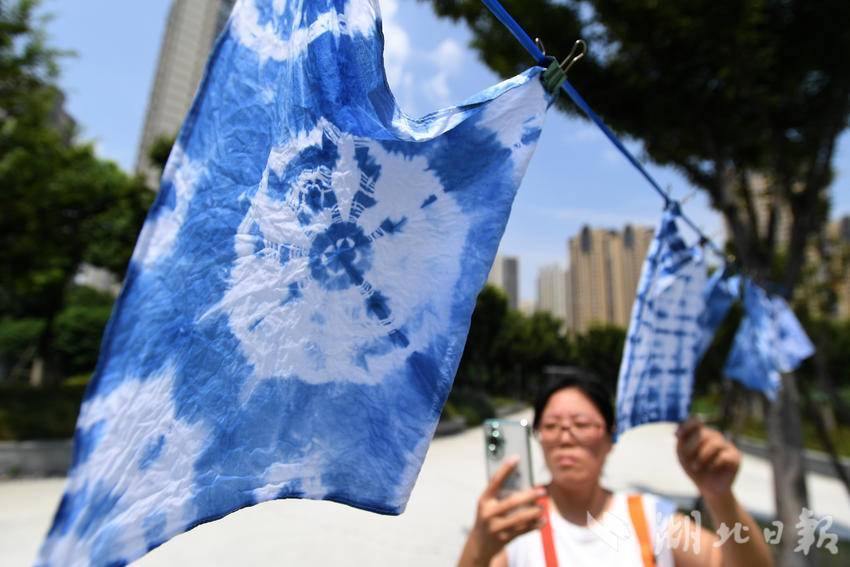 8月10日,武汉市江岸区颐湖公园举行8月文化季“邂逅扎染·布里生花”活动。在现场,市民游人用同心圆形扎法、圆圈扎法,大理石形扎法和折叠形扎法等四种扎法对布进行捆绑、勒扎,随后染色。当开启扎染作品时,犹如打开充满惊喜的色彩盲盒。白色的布经过以植物蓝靛为主染料的浸染、点缀,创意出了美妙的图案,变成了一件件独一无二的艺术作品。扎染是我国民间传统而独特的染色工艺,非物质文化遗产之一,其工艺从扎到染已有1500多年的历史,一直以独特的美点缀和美化着人民的生活。每一种不同捆扎手法、叠加上颜色,都会产生独特的花纹。 (湖北日报全媒记者 魏铼 通讯员 何梦宇 摄)