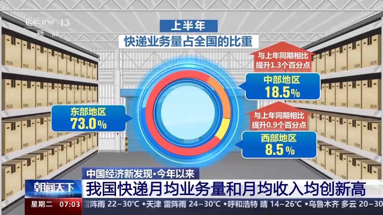 今年以来,我国快递行业发展区域结构持续优化。上半年,中、西部地区积极投产分拨中心,增强仓配能力。上半年,东、中、西部地区快递业务量占全国的比重分别为73.0%、18.5%和8.5%,与上年同期相比,中部和西部分别提升1.3个和0.9个百分点。
