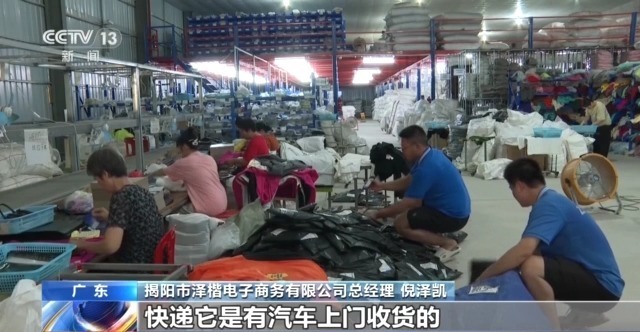 广东省揭阳市泽楷电子商务有限公司总经理 倪泽凯:我们只需要在仓库里面打单、包装,快递有汽车上门收货的,时效也非常快。省内基本上一天就可以到达,省外有一些快的两天就可以到达了。