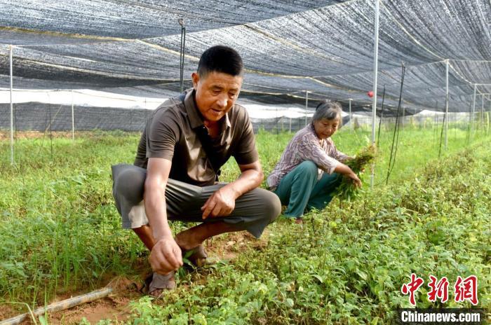 图为江西景德镇市乐平市高家镇樟木里村委会北山夏家村,中药材种苗繁育基地内,夏炳根(左一)正在岗梅苗地里劳作。朱定文 摄