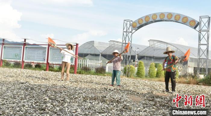 中新网景德镇8月13日电 (巫发阳 朱定文)夏日时节,走进江西景德镇市乐平市高家镇樟木里村委会北山夏家村,明媚的阳光洒在晒场上,数位农户正在翻晒中药材岗梅。