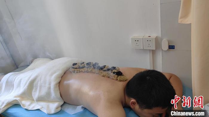 随着艾热不断渗透,做督灸的患者背部会感到温热,十分舒服。(中新网记者 陈静摄)