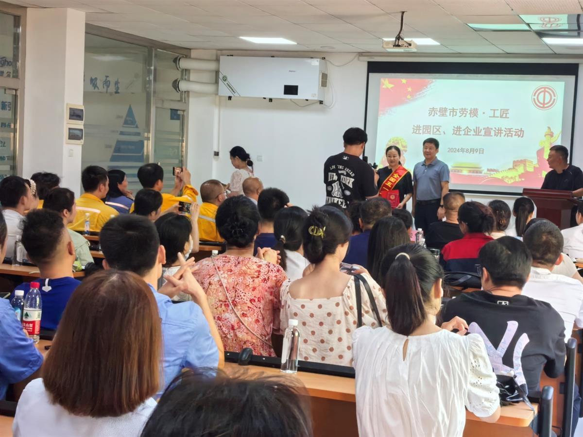 8月9日,赤壁市“堂前燕”百姓宣讲队劳模·工匠分队走进赤壁高新区,为企业职工开展劳模、工匠先进事迹宣讲。