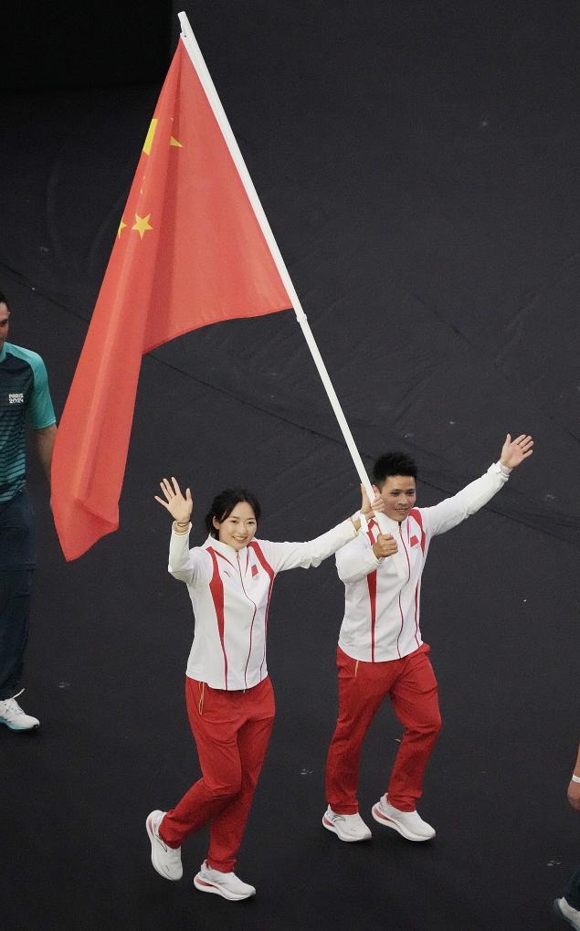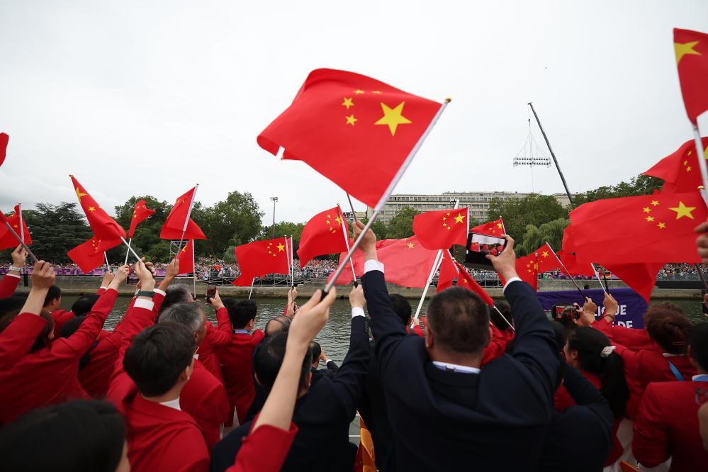 7月26日,中国体育代表团成员在开幕式上。