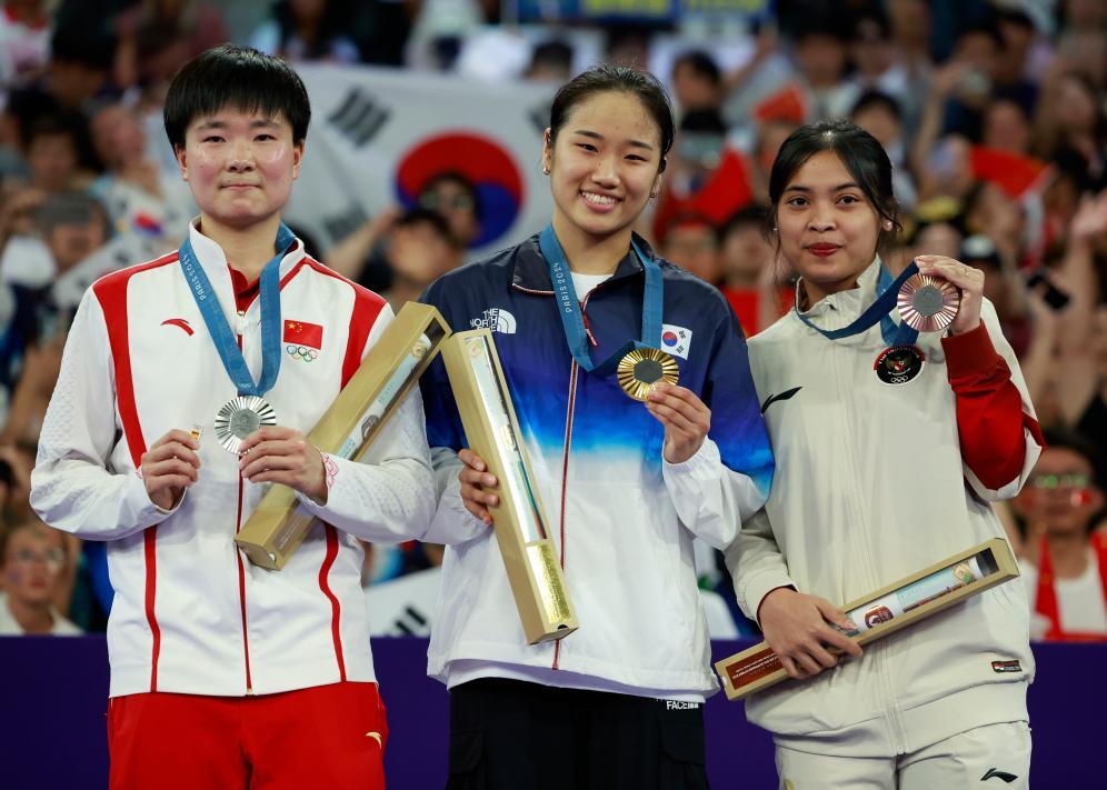 8月5日,巴黎奥运会羽毛球项目女单决赛结束。冠军韩国选手安洗莹(中)、亚军中国选手何冰娇(左)、季军印度尼西亚选手玛丽斯卡在颁奖仪式上。