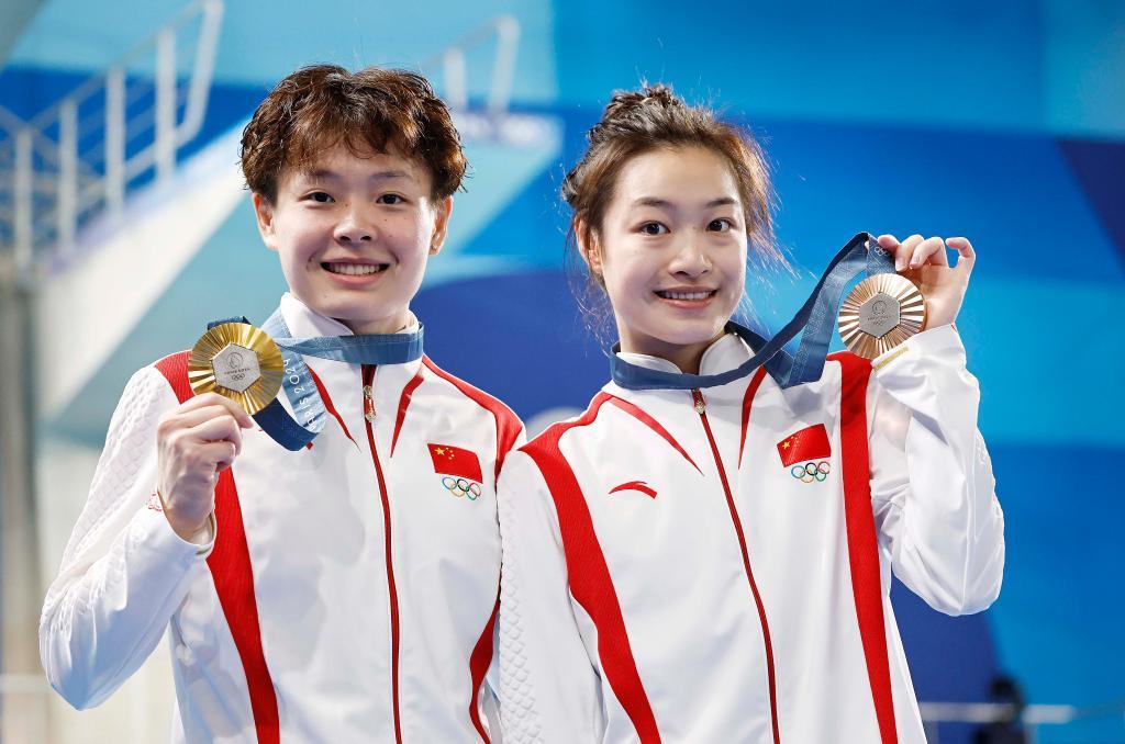 8月9日,在巴黎奥运会跳水项目女子3米板决赛中,陈艺文(左)获得金牌,昌雅妮(右)获得铜牌。