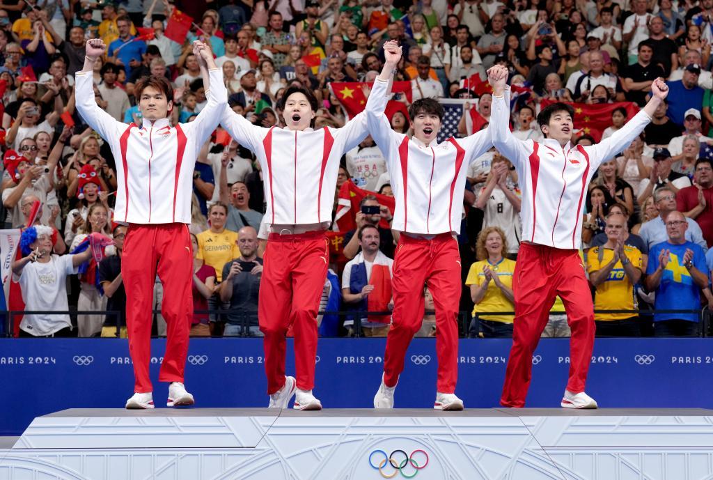 8月4日,在巴黎奥运会游泳项目男子4X100米混合泳接力决赛中,中国队以3分27秒46的成绩夺得金牌。