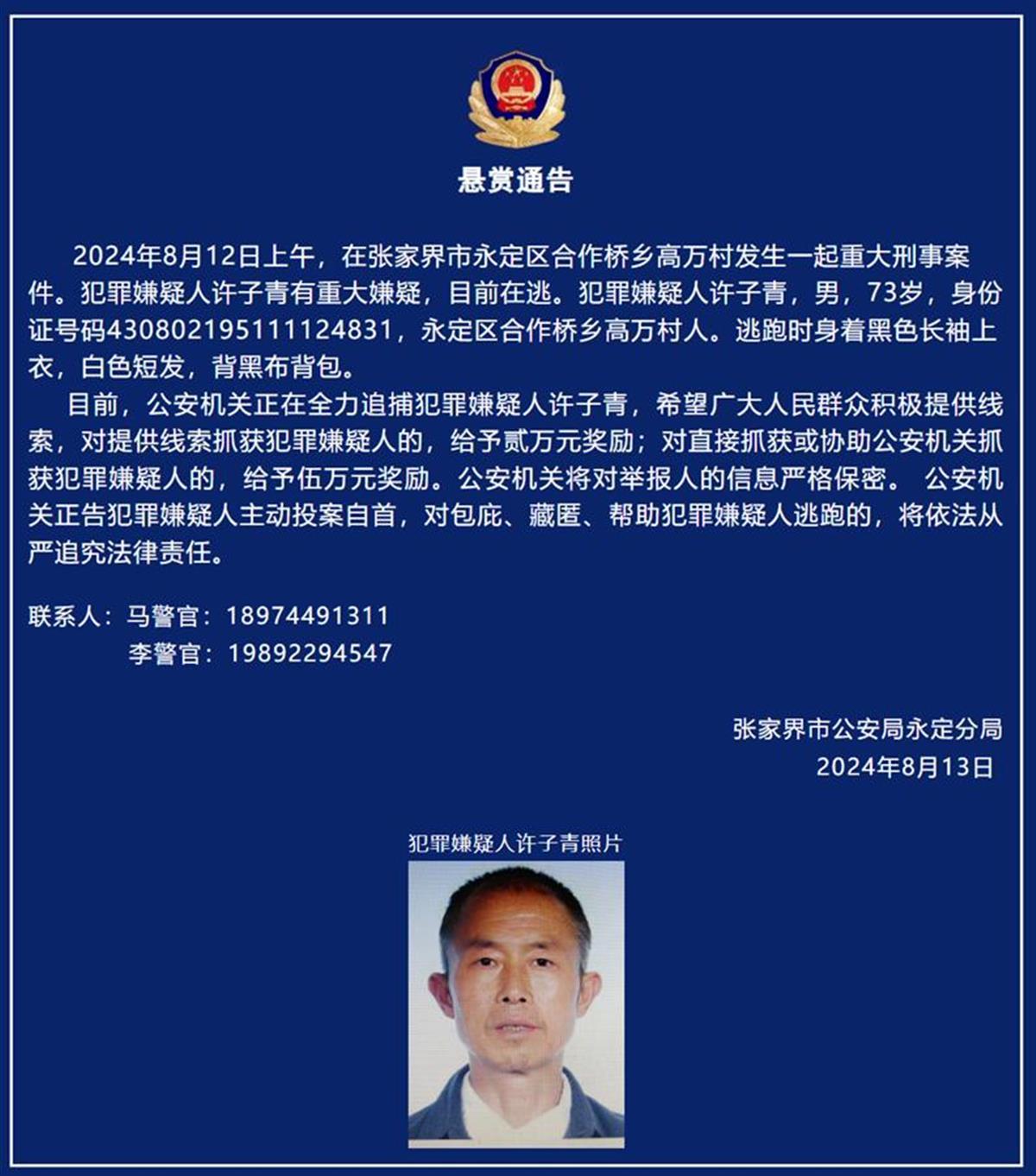 8月13日,湖南省张家界市公安局永定分局发布悬赏通告,8月12日上午,张家界市永定区合作桥乡高万村发生一起重大刑事案件,73岁的犯罪嫌疑人许子青有重大嫌疑,目前在逃,有提供线索或直接抓捕嫌疑人者最高可获得伍万元奖励。