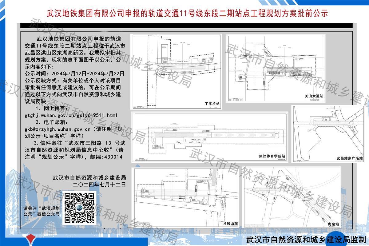 该规划方案批前公示中表示,武汉地铁集团有限公司申报的轨道交通11号线东段二期站点工程位于武汉市武昌区、洪山区、东湖高新区。