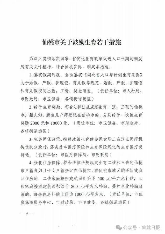在住房保障方面,符合法律法规规定生育二孩、三孩的仙桃市户籍夫妇,且子女户籍登记在仙桃市,在仙桃市城区购买新建商品住房时,可分别获得住房补贴500元/平方米、800元/平方米;享受叠加政策的,每套住房补贴上限为1000元/平方米(以上均为建筑面积)。