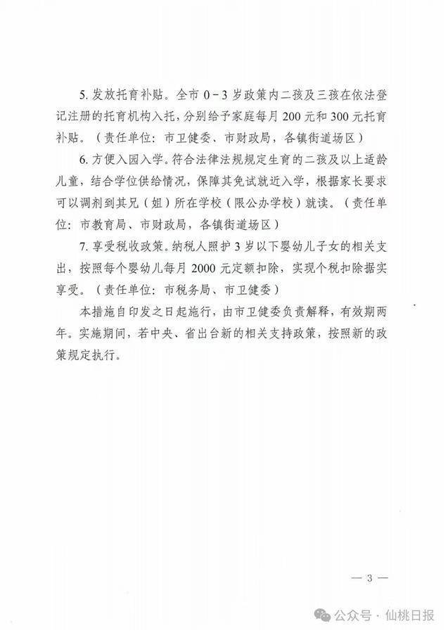 在托育补贴方面,该市0岁至3岁政策内二孩、三孩,在依法登记注册的托育机构入托,家庭每月可分别获得入托补贴200元、300元。