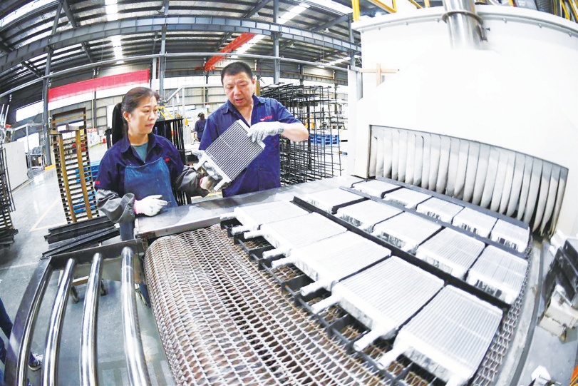 秀山智能科技有限公司工人在生产线上查看散热器产品。