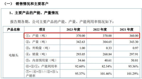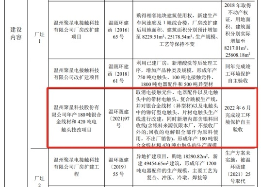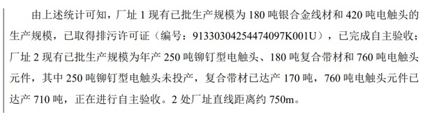 环球网记者注意到,2023年11月,聚星科技生产线智能化技术改造项目曾公开发布环境影响报告表,该表披露聚星科技的电触头产能与招股书自相矛盾。环境影响报告表显示,公司目前有两个厂址,厂址1现有已批生产规模为180吨银合金线材和420吨电触头的生产规模,已完成自主验收;厂址2现有已批生产规模为年产250吨铆钉型电触头、180吨复合带材和760吨电触头元件,其中250吨铆钉型电触头未投产,复合带材已达产170吨,760吨电触头元件已达产710吨,正在进行自主验收。据此披露,公司电触头产能为420吨,并非招股书披露的370吨。