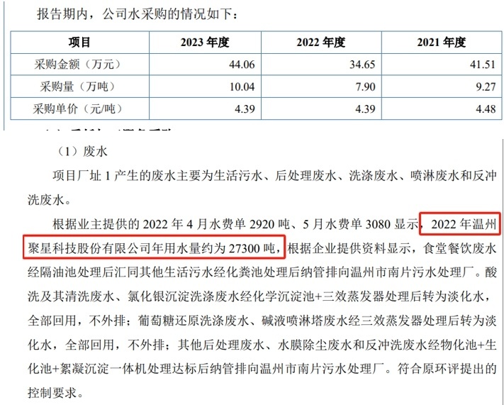 除了产能数据披露自相矛盾外,聚星科技对于水的用量披露也存在差异。公司招股书显示,2022年,公司采购水7.9万吨。但“生产线智能化技术改造项目”环境影响报告表显示,2022年公司用水量约为2.73万吨。换句话说,招股书披露的2022年用水量是环评文件披露数据的2.9倍。用水量是环评的重要指标之一,聚星科技环评文件用水数据是否准确,是否影响环评准确性,环球网发函求证,公司未直接回应。