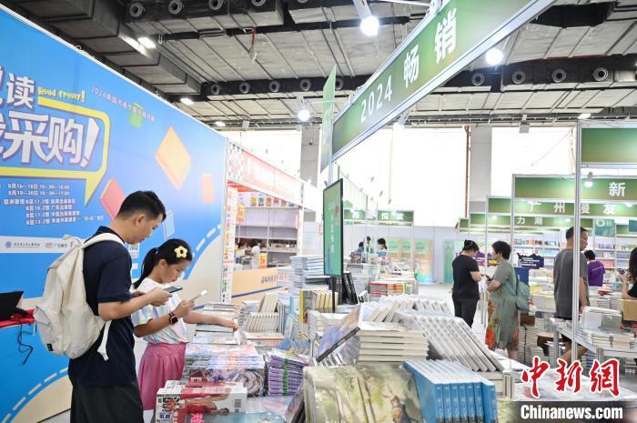 8月16日,广东广州,“2024南国书香节暨羊城书展”开幕。本届南国书香节主会场设于中国进出口商品交易会展馆B区,共有70多家优秀出版机构参展,展销各类出版物、文创产品30余万种,还设立521个分会场,举办2000多场重点活动。图为书籍吸引读者翻阅选购。中新社记者 陈楚红 摄