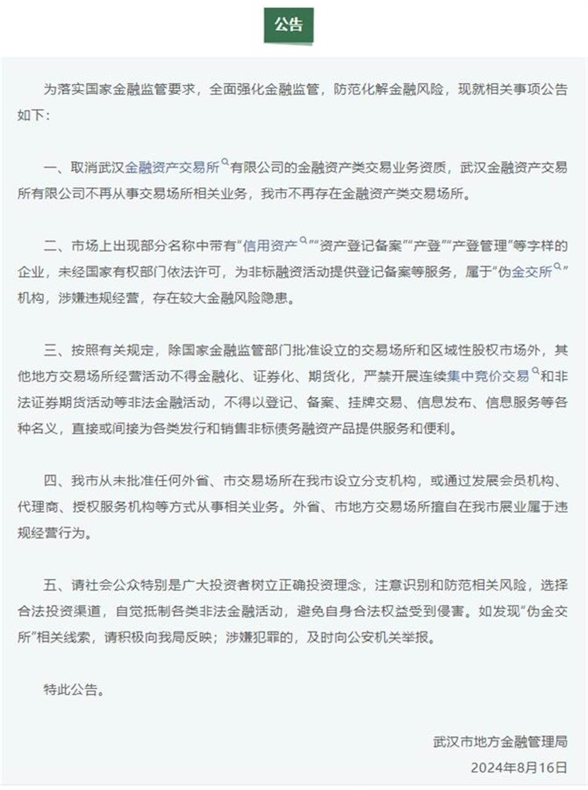 公告称,为落实国家金融监管要求,全面强化金融监管,防范化解金融风险,公告“取消武汉金融资产交易所有限公司的金融资产类交易业务资质,武汉金融资产交易所有限公司不再从事交易场所相关业务,我市不再存在金融资产类交易场所。”