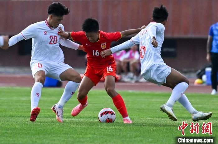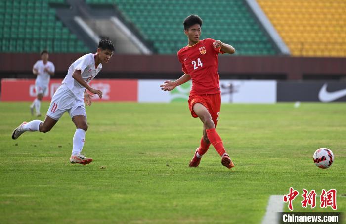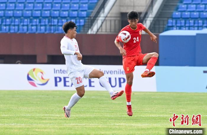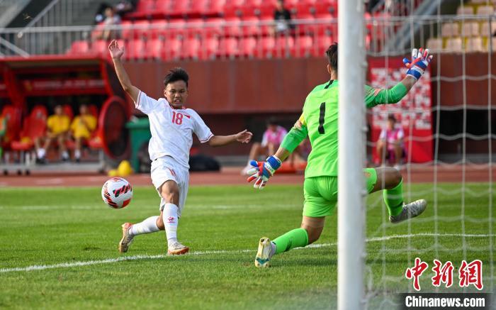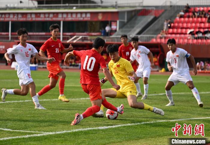 8月16日,2024CFA中国之队·沈阳“和平杯”国际足球邀请赛,中国U16国家男子足球队vs越南U16国家男子足球队的比赛在辽宁沈阳城市体育场举行。最终,中国U16国家男子足球队4:0胜越南U16国家男子足球队。图为越南队球员阮泰华(左)在比赛中射门。中新社记者 于海洋 摄