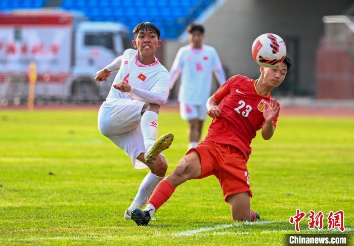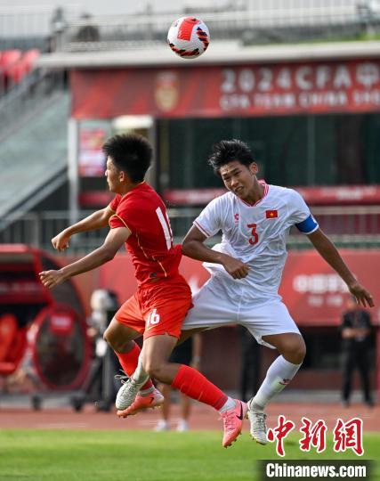 8月16日,2024CFA中国之队·沈阳“和平杯”国际足球邀请赛,中国U16国家男子足球队vs越南U16国家男子足球队的比赛在辽宁沈阳城市体育场举行。最终,中国U16国家男子足球队4:0胜越南U16国家男子足球队。图为越南队球员黎惠越安(右)在比赛中争顶头球。中新社记者 于海洋 摄