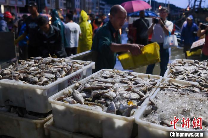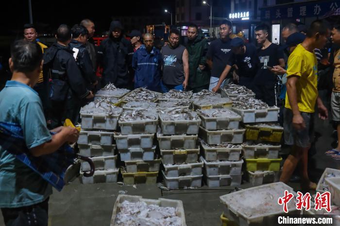 8月17日,广东阳江闸坡国家级中心渔港内,渔船满载南海开渔后的首批渔获归来,新鲜渔获吸引采购商挑选。为期三个半月的2024年南海伏季休渔期于8月16日结束,广东沿海地区两万多艘渔船陆续奔赴远洋,开启新一轮耕海牧渔的生活。中新社记者 陈骥旻 摄