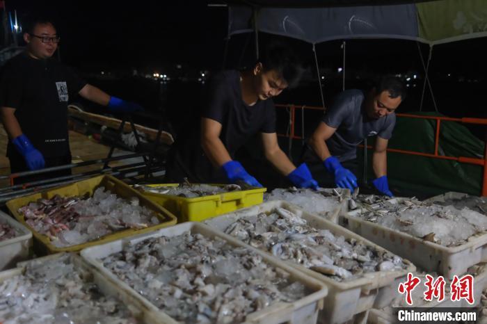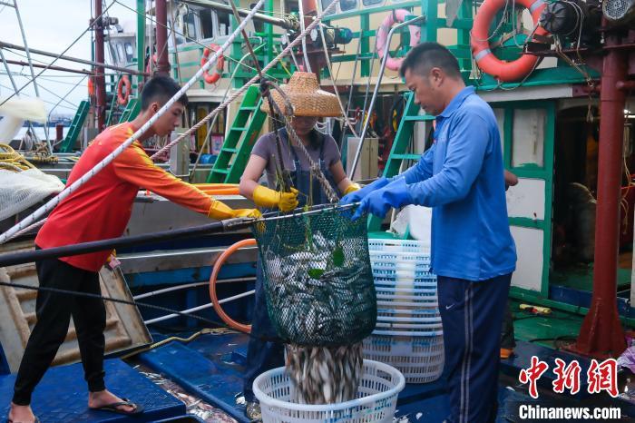 8月17日,广东阳江闸坡国家级中心渔港内,渔船满载南海开渔后的首批渔获归来,渔民分拣渔获。为期三个半月的2024年南海伏季休渔期于8月16日结束,广东沿海地区两万多艘渔船陆续奔赴远洋,开启新一轮耕海牧渔的生活。中新社记者 陈骥旻 摄