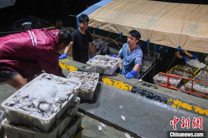 8月17日,广东阳江闸坡国家级中心渔港内,渔船满载南海开渔后的首批渔获归来,渔民搬运渔获。为期三个半月的2024年南海伏季休渔期于8月16日结束,广东沿海地区两万多艘渔船陆续奔赴远洋,开启新一轮耕海牧渔的生活。中新社记者 陈骥旻 摄