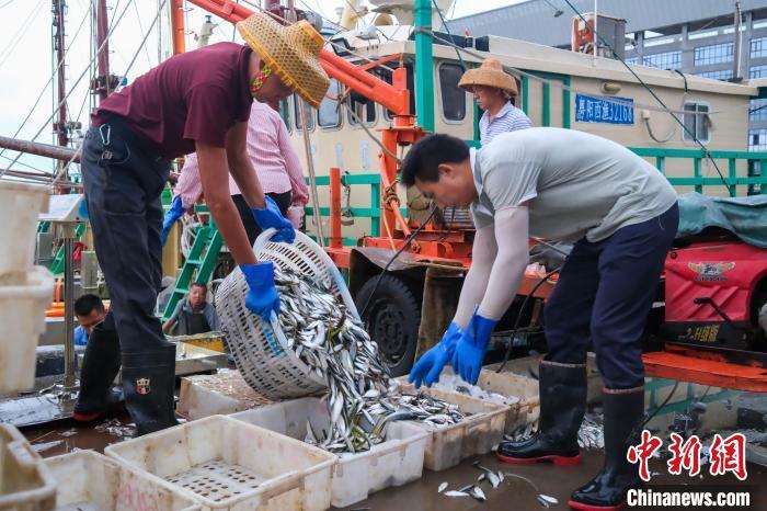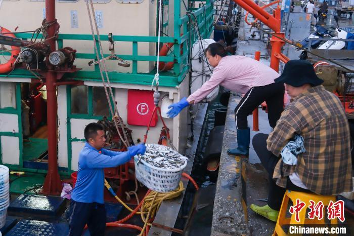 8月17日,广东阳江闸坡国家级中心渔港内,渔船满载南海开渔后的首批渔获归来。为期三个半月的2024年南海伏季休渔期于8月16日结束,广东沿海地区两万多艘渔船陆续奔赴远洋,开启新一轮耕海牧渔的生活。中新社记者 陈骥旻 摄