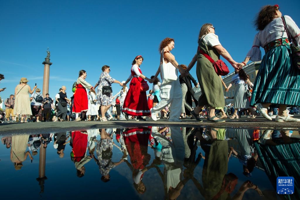 8月15日,人们在俄罗斯圣彼得堡冬宫广场跳圆圈舞。