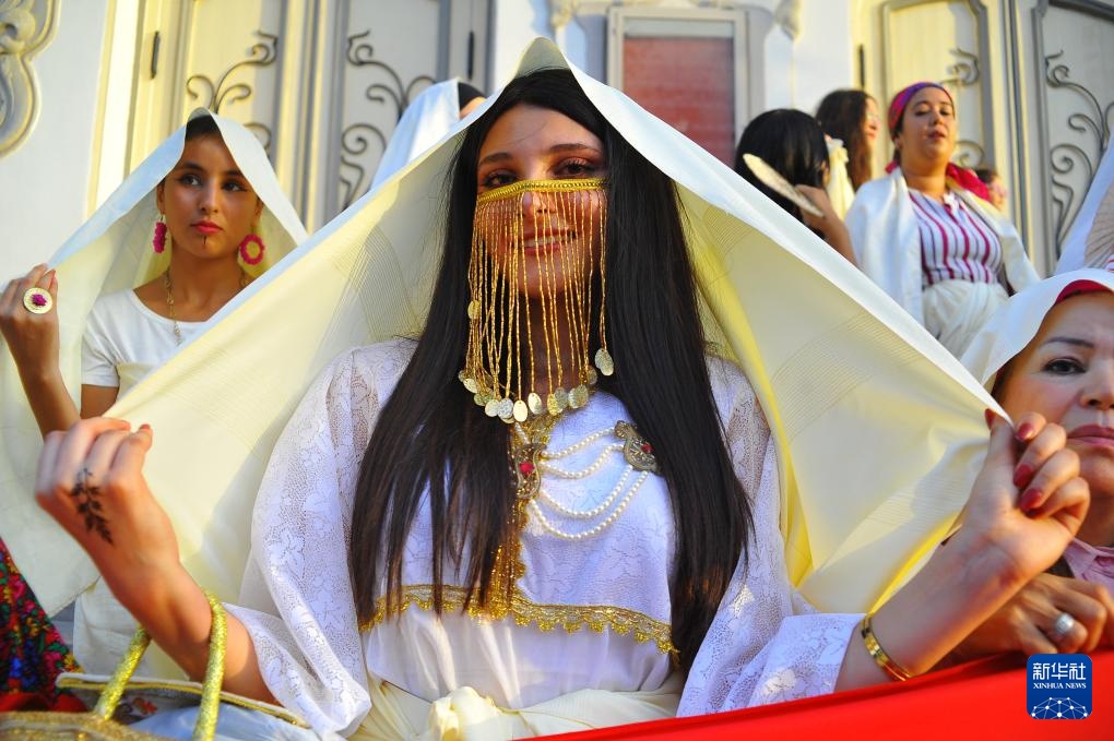 8月13日,在突尼斯首都突尼斯市,身着民族服装的妇女参加妇女节庆祝活动。