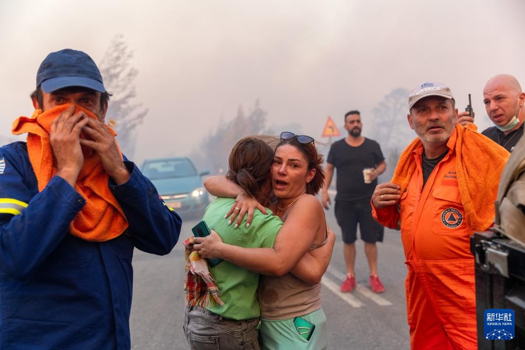 8月11日,在距希腊雅典市区东北方向35公里的瓦尔纳瓦斯地区,当地居民和消防员聚集在火灾现场。