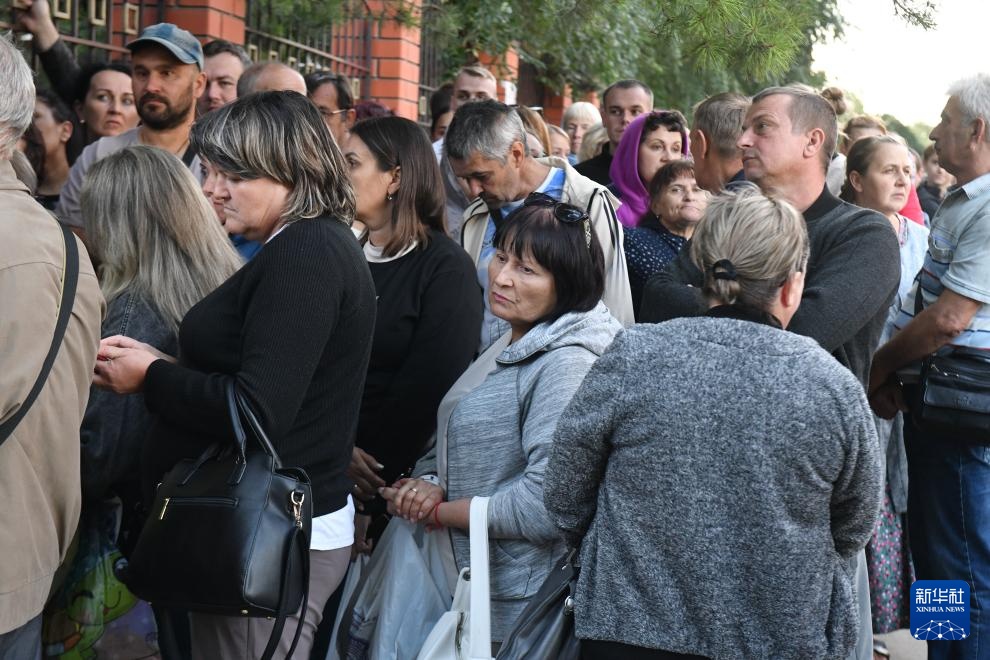 8月13日,在俄罗斯库尔斯克市,来自俄乌边境地区的居民排队领取救援物资。
