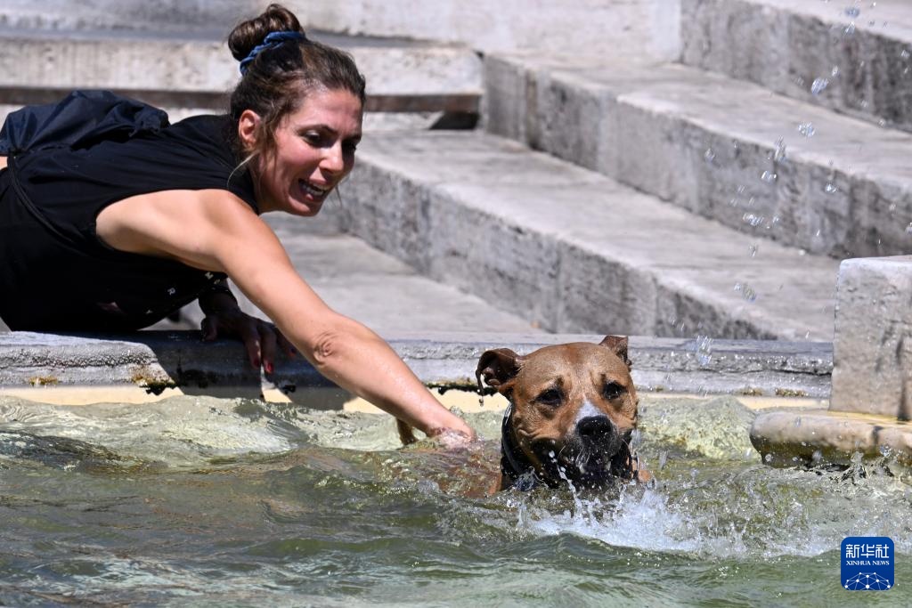 8月14日,在意大利罗马,一只狗跳入喷泉。