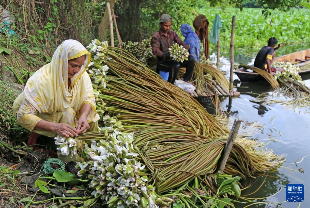 8月13日,在孟加拉国蒙希甘杰,当地人将采摘的睡莲打捆整理。