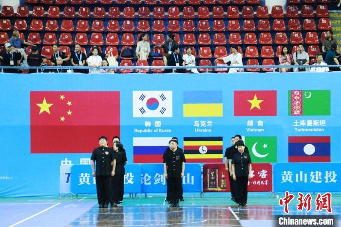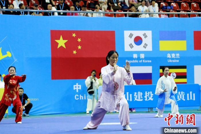 8月17日,黄山建投杯·第五届黄山论剑国际武术大赛在安徽省黄山市体育馆开幕,吸引韩国、越南、马里等11个国家和地区以及中国18个省市的100支代表队1329名武术爱好者报名参赛。图为选手们在展示太极拳技艺。中新社记者 张强 摄